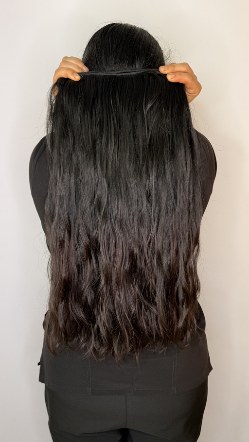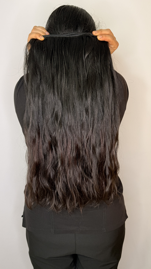 Extensión de cabello humano ondulado en un tono negro profundo con ligeros reflejos castaños hacia las puntas. Con 24 pulgadas de largo y un ancho de 3.8 metros, aporta volumen y movimiento natural al cabello sin ser para peinada completa. Esta textura ofrece un brillo sutil que realza la apariencia del cabello natural.