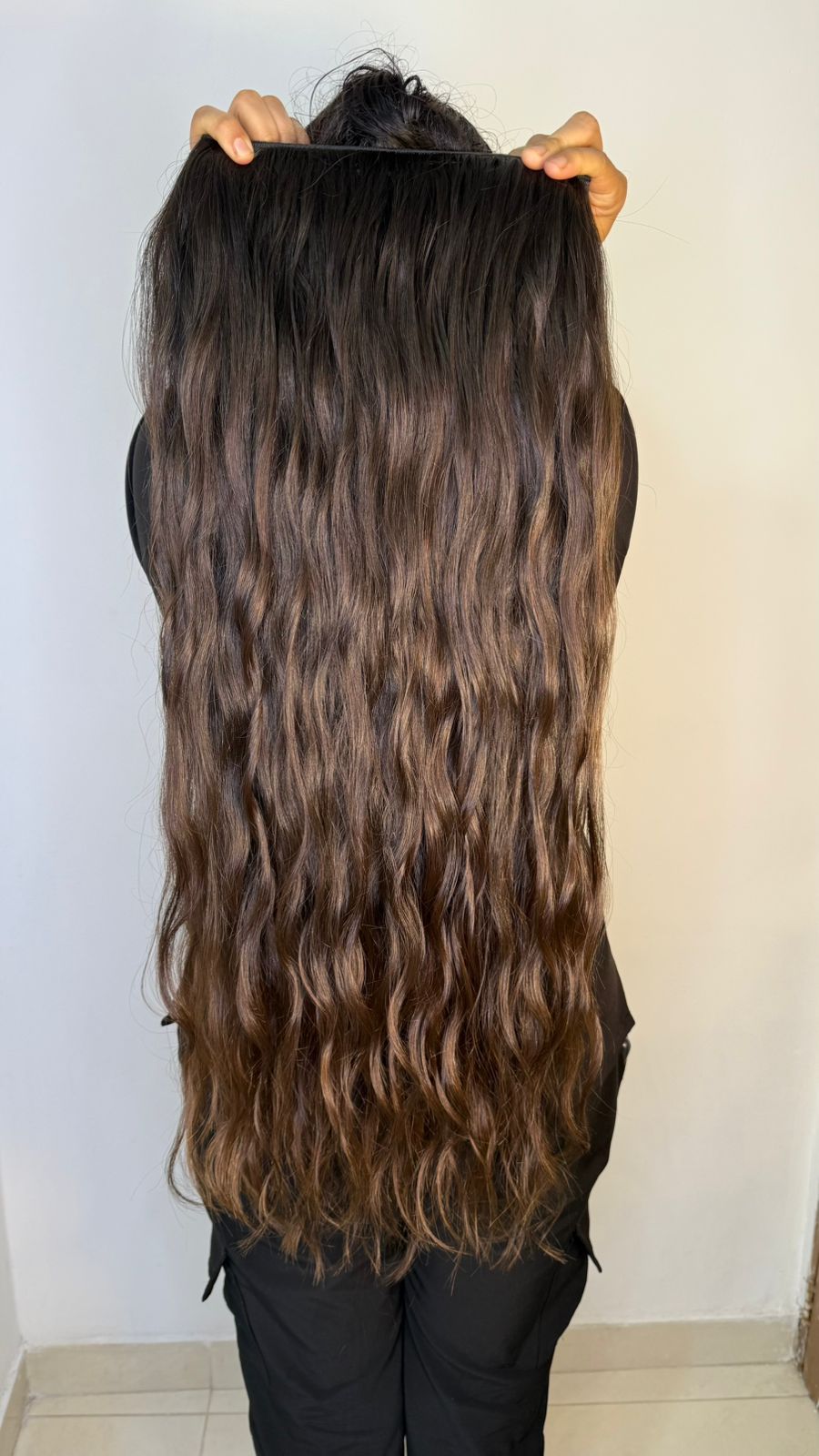 Extensión 100% humana extra larga de 33″ con 4 m 10 cm de ancho. Color castaño oscuro con reflejos, textura ondulada definida. Ideal para peinada completa.