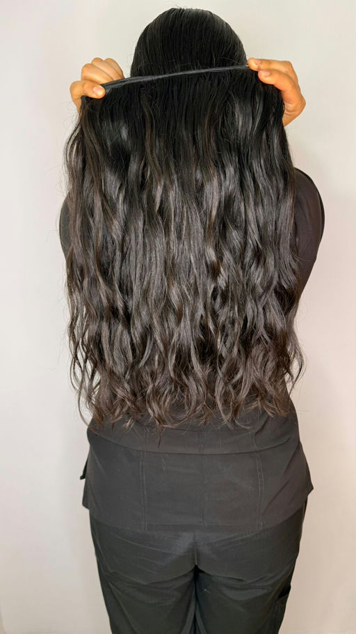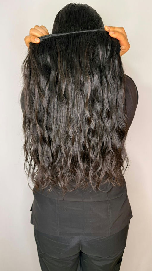 Cabello humano ondulado abundante peinda completa con un largo 20 pulgadas y ancho de 4.20 mtr Su textura y el brillo natural aportan un volumen elegante y una caída impecable.
