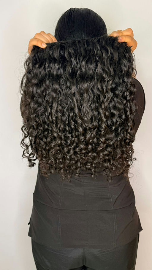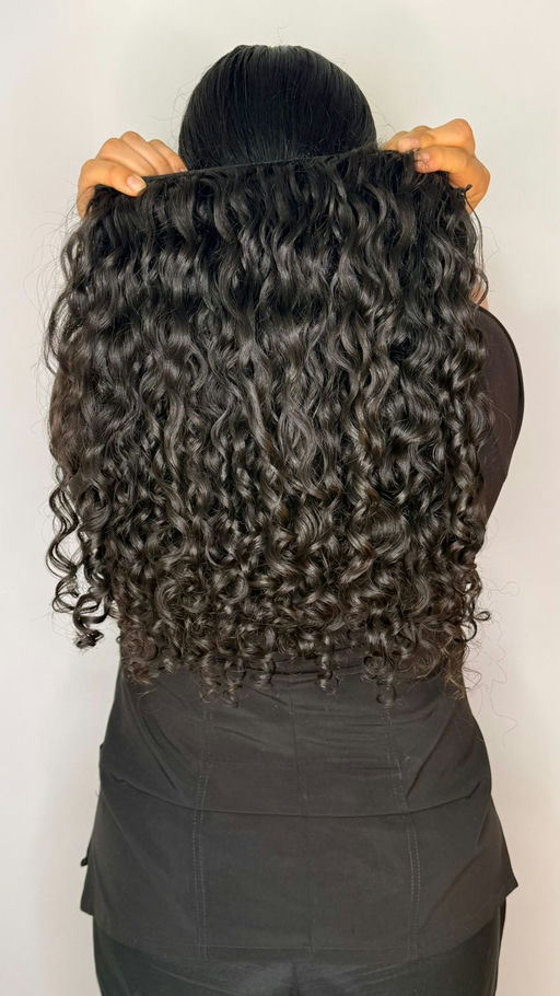 Extensión de cabello humano rizado en un tono negro natural, con rizos definidos que aportan movimiento y volumen. Con un largo de 20 pulgadas y un ancho de 4.2 metros, esta extensión es ideal para una peinada completa, ofreciendo un brillo saludable y textura uniforme.