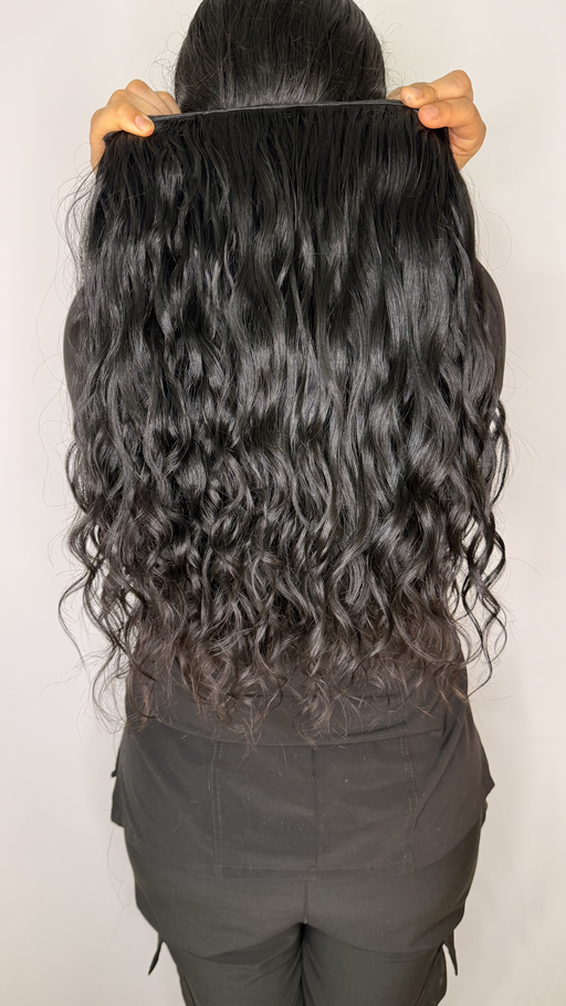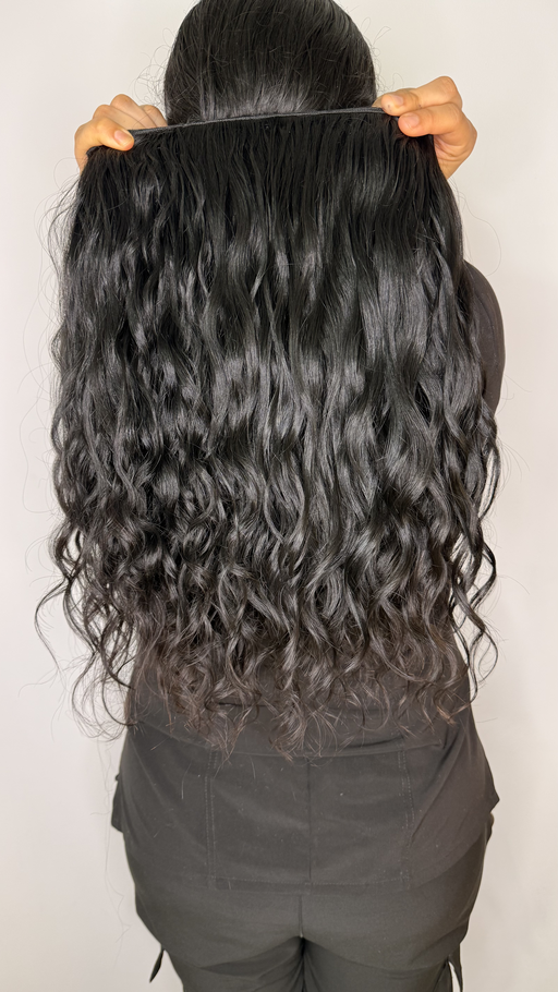 Extensión de cabello humano ondulado en un tono negro natural con un largo de 22 pulgadas. Su textura definida ofrece un movimiento fluido y un brillo saludable, ideal para aportar volumen sin cubrir una peinada completa.