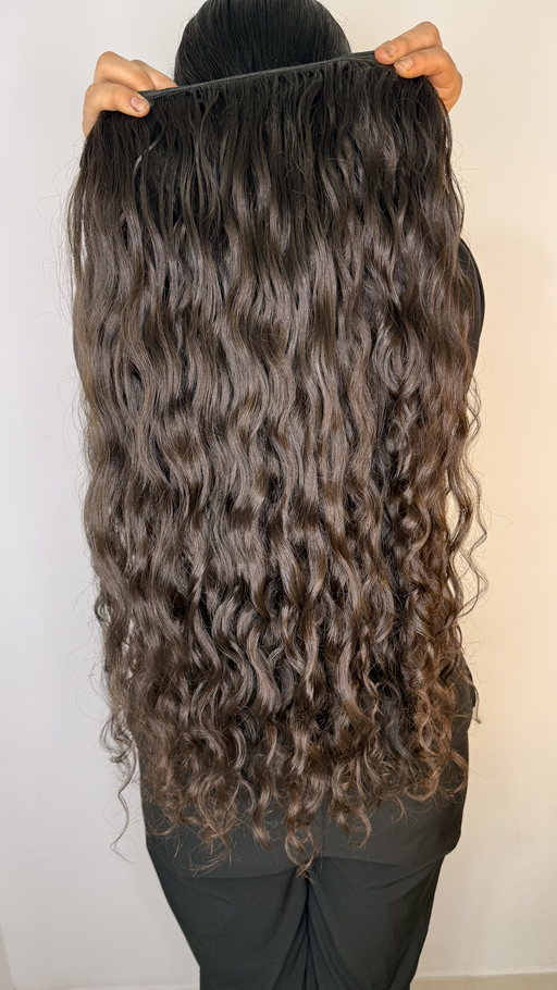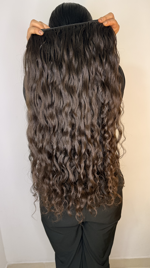 Extensión de cabello humano de textura ondulada con un color castaño oscuro natural, que aporta un brillo sutil y movimiento definido. Con un largo de 29 pulgadas y un ancho de 4.2 metros, esta extensión es ideal para una peinada completa que ofrece volumen y un acabado elegante.