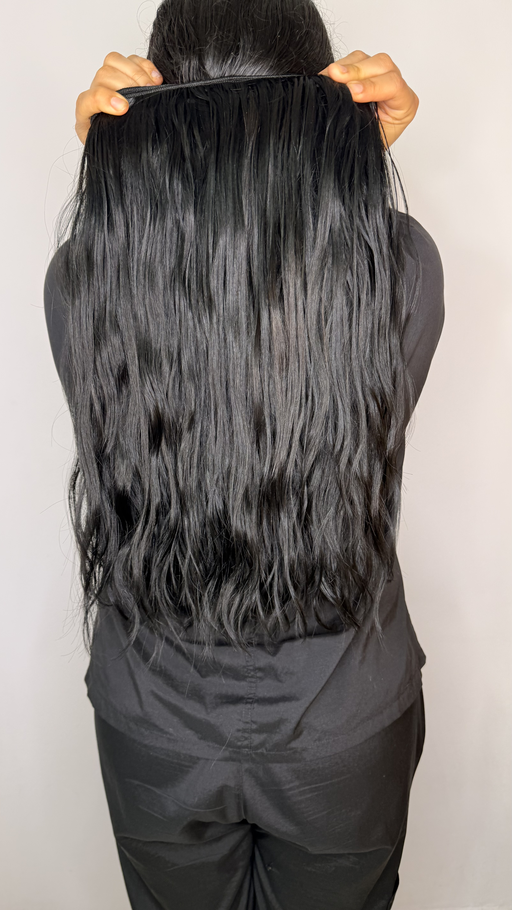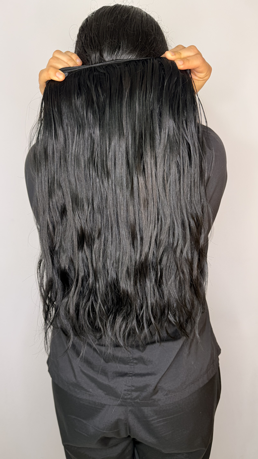 Extensión de cabello humano con textura lisa y ligera ondulación visible, en un color negro profundo y natural. Con 21 pulgadas de largo y 4 metros de ancho, aporta volumen y movimiento con un brillo saludable, ideal para peinada completa.