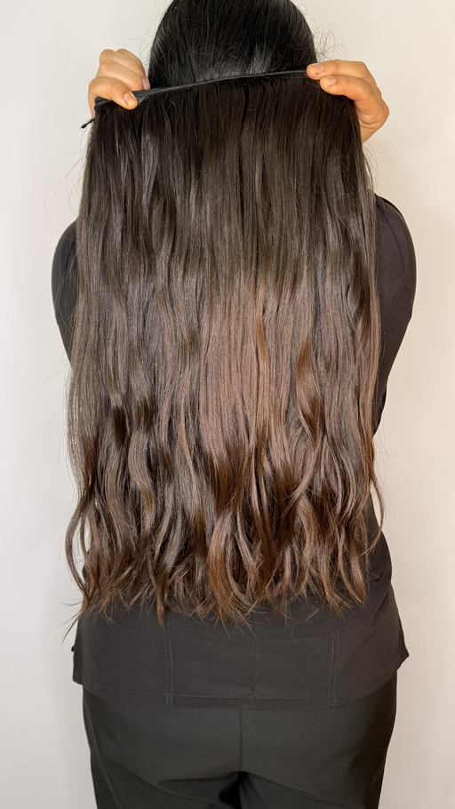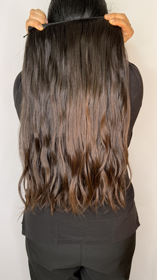 Extensión de cabello humano ondulado, con textura suave y movimiento natural. Presenta un color castaño oscuro con reflejos sutiles que aportan brillo y profundidad. Con un largo de 22 pulgadas y un ancho de 4 metros, esta extensión aporta volumen ideal para una peinada completa, ofreciendo un acabado elegante y natural.