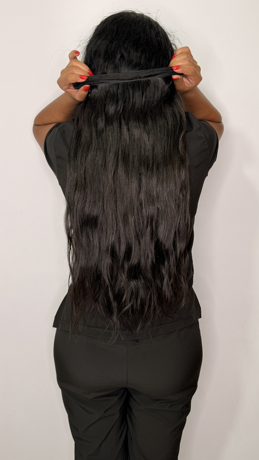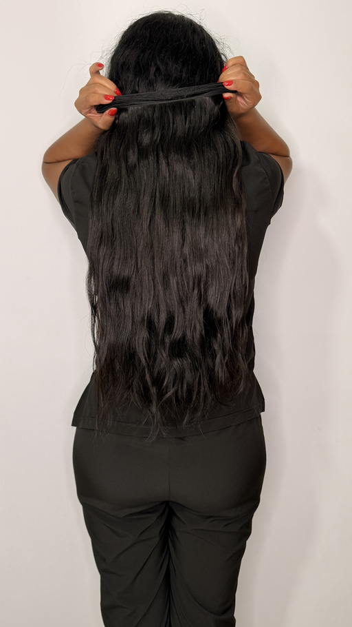 Extensión de cabello humano ondulado en un profundo color negro natural, con textura suave y ondas definidas que aportan movimiento y volumen. Con un largo de 24 pulgadas y un ancho de 4 metros, esta extensión es ideal para una peinada completa, realzando el brillo y la naturalidad del cabello.