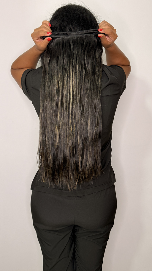 Extensión de cabello humano de 22 pulgadas con textura crespa/rizo definida y un color negro intenso. Con un ancho de 4 metros, esta extensión aporta volumen y movimiento natural, ideal para una peinada completa con brillo saludable.