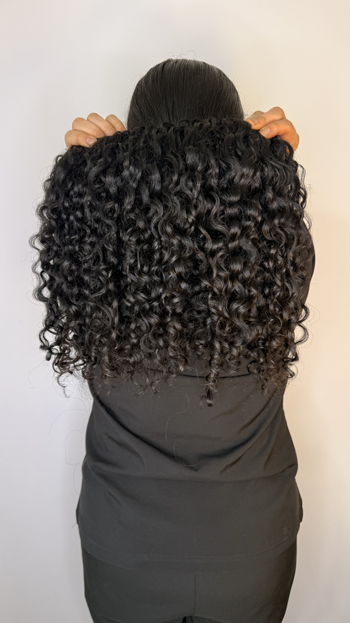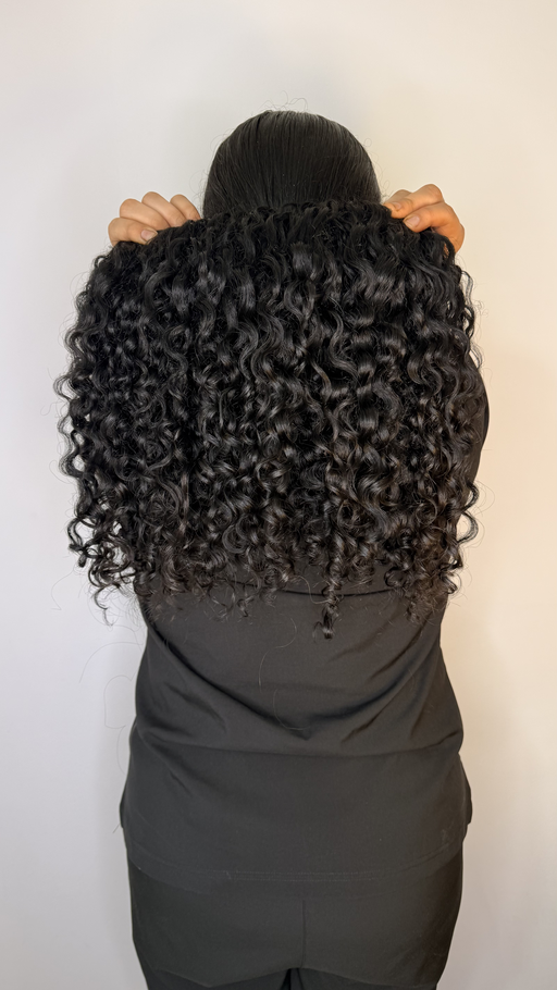 Extensión de cabello humano con textura crespa/rizo definida y brillante, en un tono negro profundo. Con un largo de 18 pulgadas y un ancho de 4.4 metros, esta extensión aporta volumen y movimiento natural, ideal para una peinada completa con cabello natural.