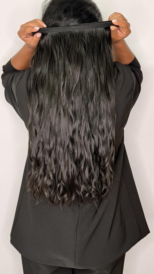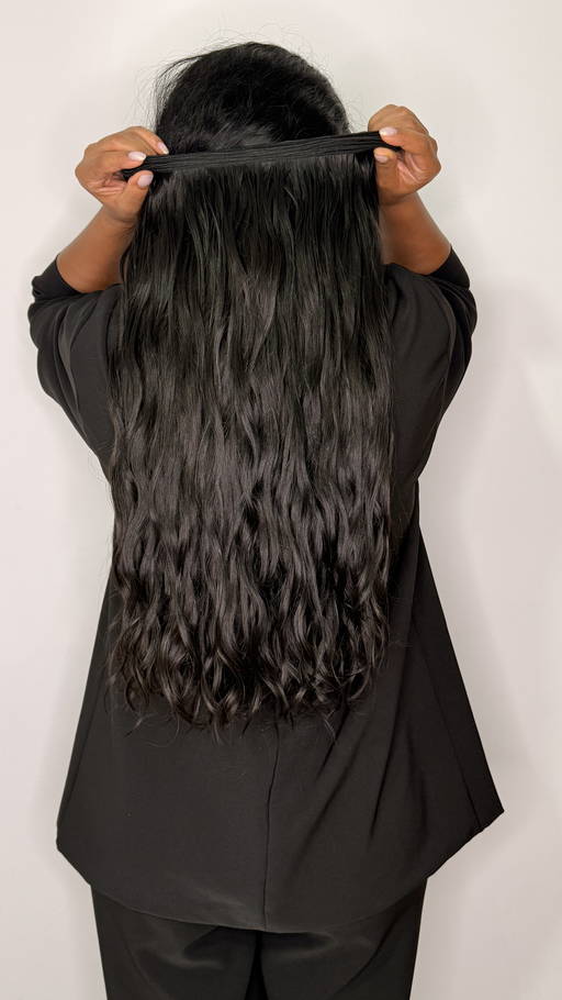 Extensión de cabello humano ondulado en un profundo color negro natural, con una textura suave y movimiento definido que aporta brillo y volumen. Con un largo de 24 pulgadas y un ancho de 4.4 metros, esta extensión es ideal para una peinada completa, ofreciendo un acabado elegante y natural.