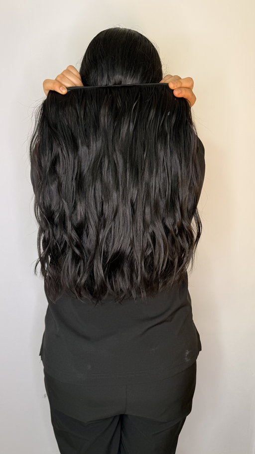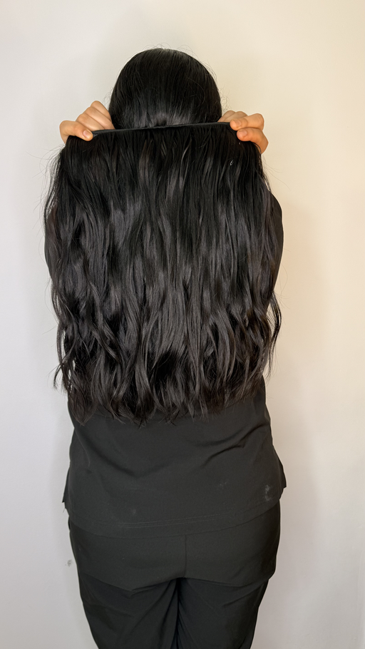 Extensión de cabello humano ondulado en color negro natural, con una textura suave y brillo intenso que refleja movimiento y volumen. Con un largo de 19 pulgadas y un ancho de 4.5 metros, esta extensión aplica para peinada completa, ideal para quienes buscan un acabado natural y abundante en su cabello.