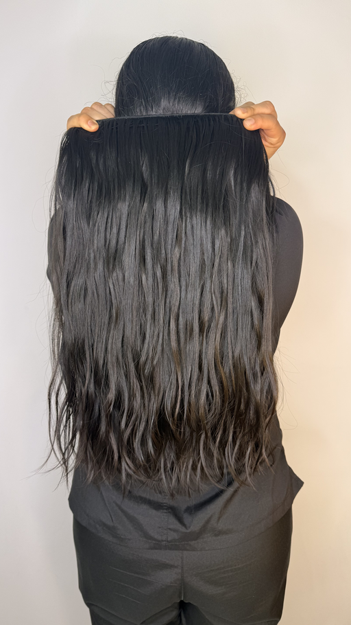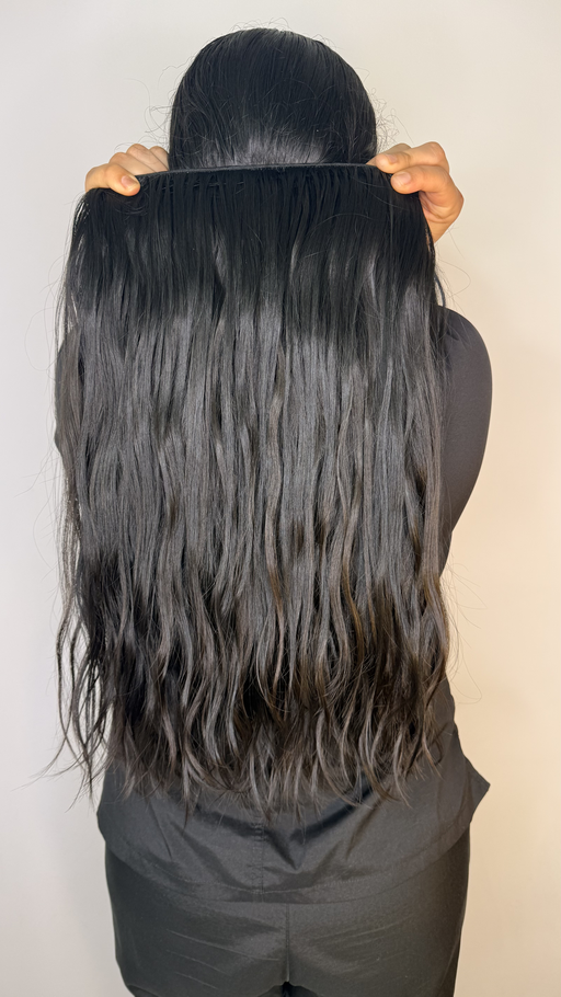 Extensión de cabello humano de 4.2 metros de ancho, ideal para peinada completa. Presenta una textura mayormente lisa con ligeras ondas naturales, que aportan movimiento y volumen al cabello natural. Su color negro profundo realza el brillo y la apariencia saludable del cabello.