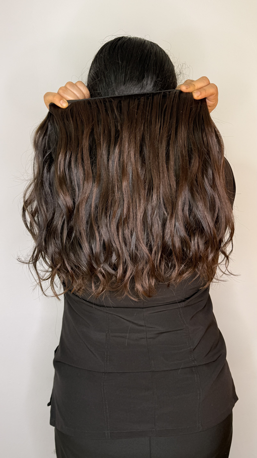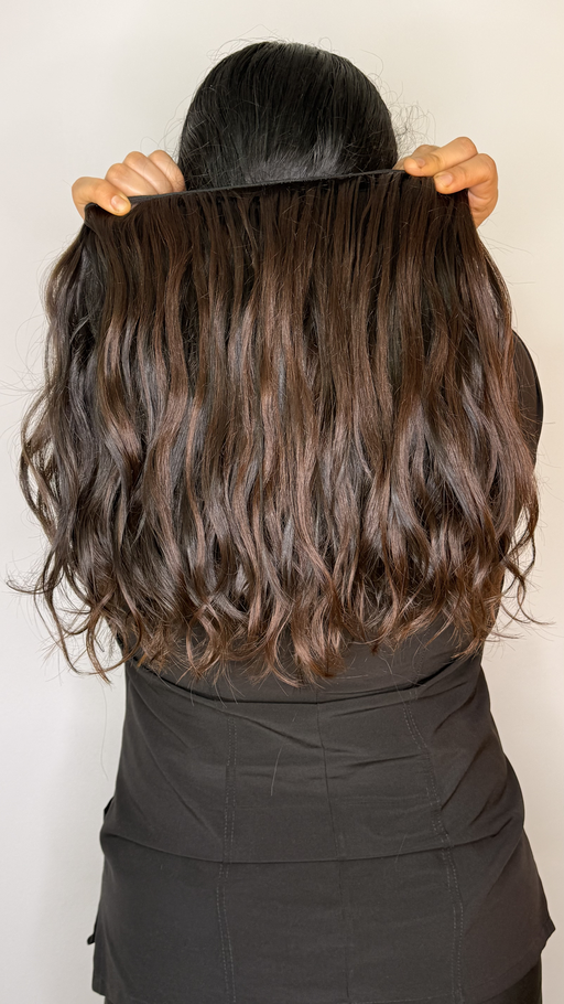Extensión de cabello humano ondulado en tono castaño oscuro con reflejos sutiles que aportan profundidad y brillo natural. Con una longitud de 16 pulgadas y un ancho de 4.8 metros, esta extensión permite una peinada completa, ofreciendo volumen y movimiento para un look sofisticado y natural.