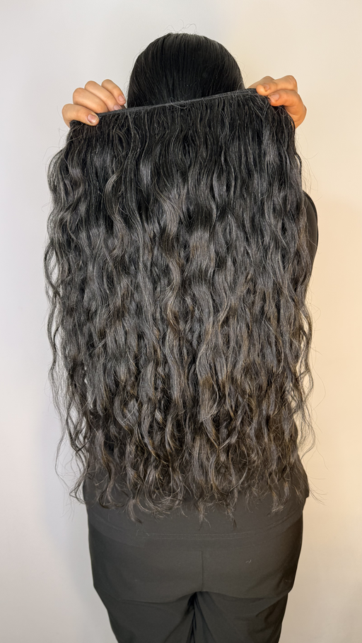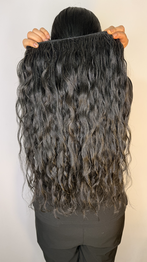 Extensión de cabello humano ondulado en color negro natural, con un largo de 24 pulgadas y un ancho de 4.8 metros, ideal para peinada completa. Este cabello natural ofrece textura definida, volumen y movimiento con un brillo saludable que realza cualquier estilo.