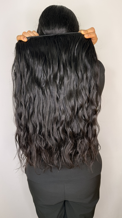 Extensión de cabello humano con textura ondulada natural y color castaño oscuro, ideal para aportar brillo y movimiento. Con 24 pulgadas de largo y un ancho de 4.8 metros, esta extensión es perfecta para una peinada completa con volumen y caída elegante.