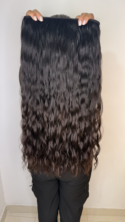 Extensión de cabello humano ondulado en color castaño oscuro, con una textura natural que aporta movimiento y brillo al cabello. Su largo de 30 pulgadas y ancho de 4.8 metros la hacen ideal para una peinada completa, ofreciendo volumen y un acabado elegante.