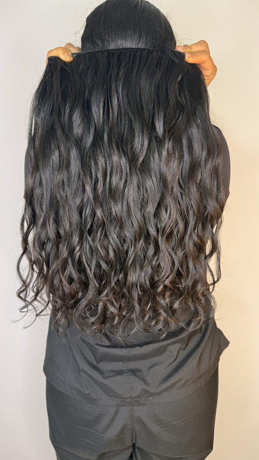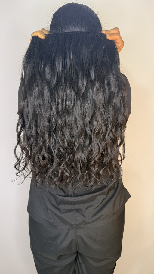 Extensión de cabello humano ondulado en color negro profundo, con una textura natural que aporta un movimiento definido y un brillo saludable. Con un largo de 21 pulgadas y un ancho de 4 metros, esta extensión es ideal para una peinada completa que realza el volumen y la elegancia.