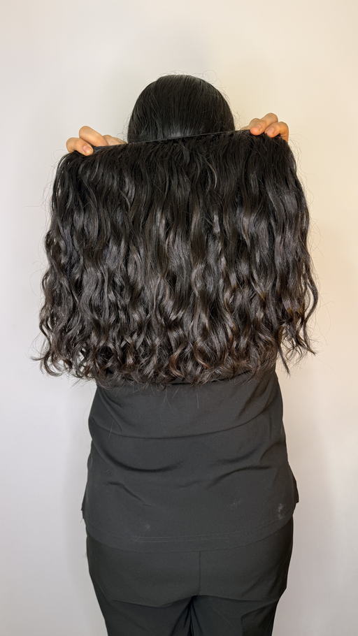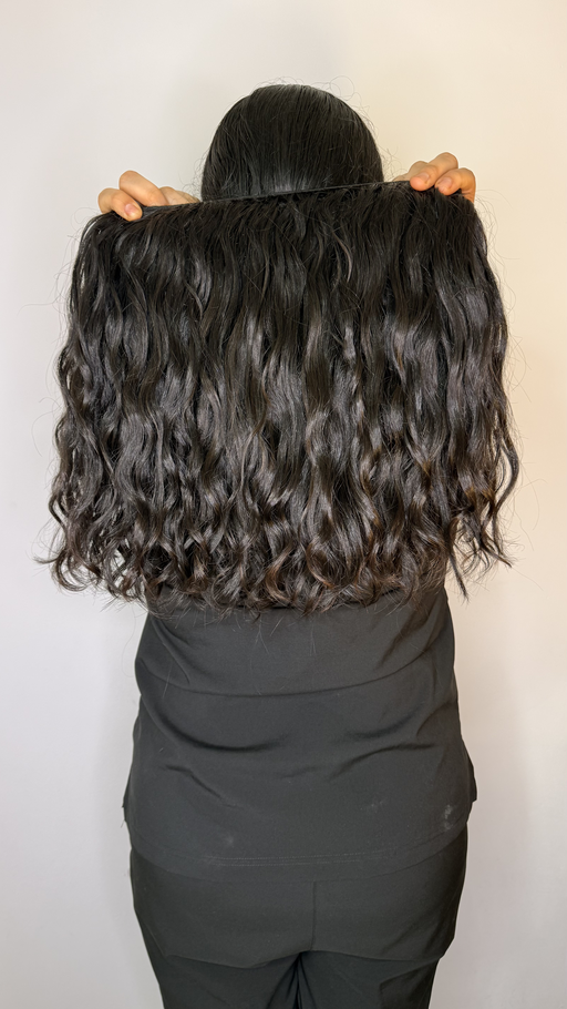 Extensión de cabello humano ondulado en un tono negro profundo, con una textura suave que aporta movimiento natural y brillo saludable. Con 16 pulgadas de largo, ofrece un volumen abundante y un ancho de 5.2 metros que permite una peinada completa, ideal para quienes buscan realzar su cabello natural con un acabado elegante y lleno de vida.