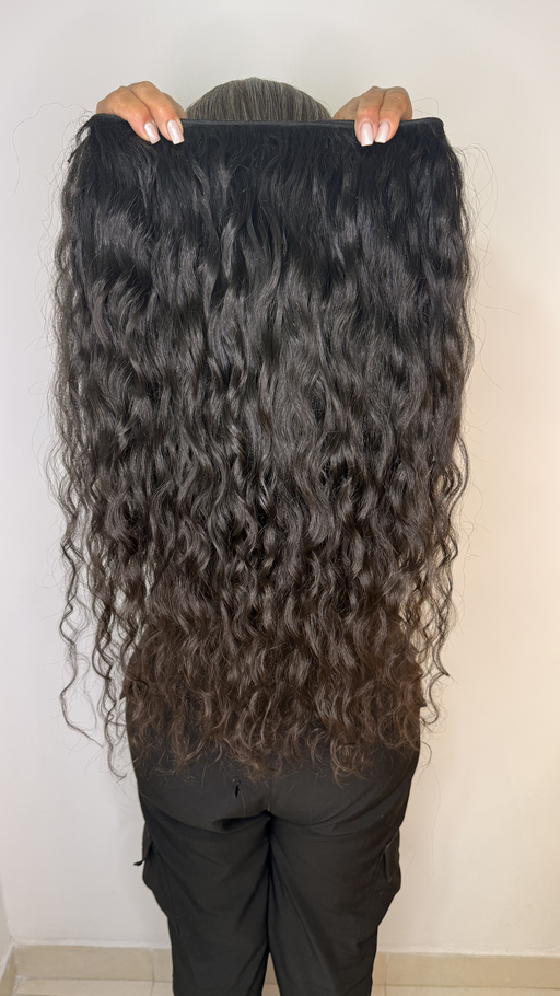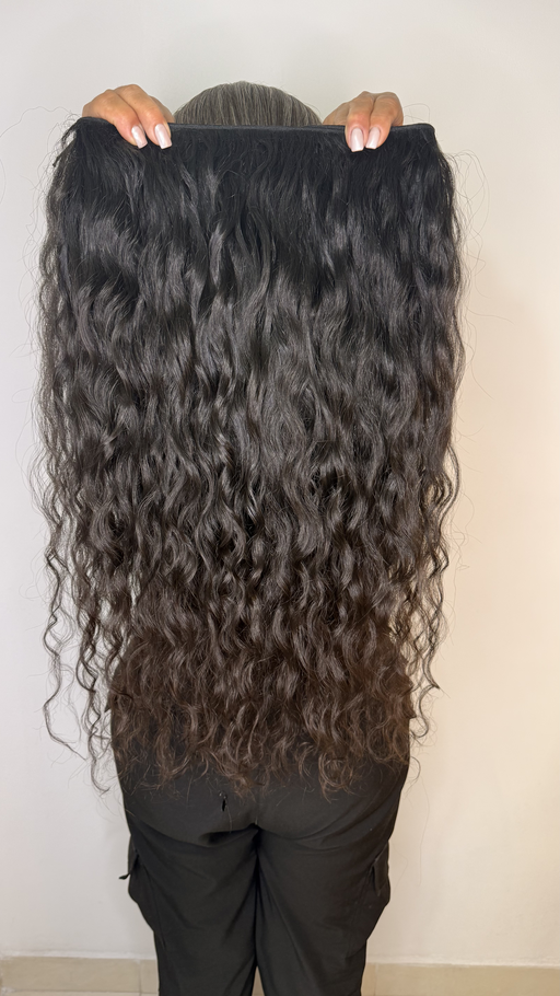 Extensión de cabello humano ondulado en un profundo tono negro natural con un largo de 28 pulgadas. Su textura ondulada aporta movimiento y volumen con un brillo saludable, ideal para quienes buscan realzar su estilo con cabello natural de alta calidad.