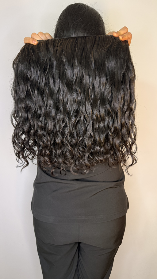 Extensión de cabello humano ondulado en color negro profundo, con textura definida y brillo natural que aporta movimiento y volumen. Con un largo de 20 pulgadas y un ancho de 5.6 metros, es ideal para una peinada completa que realza el cabello natural con un acabado elegante y lleno de vida.